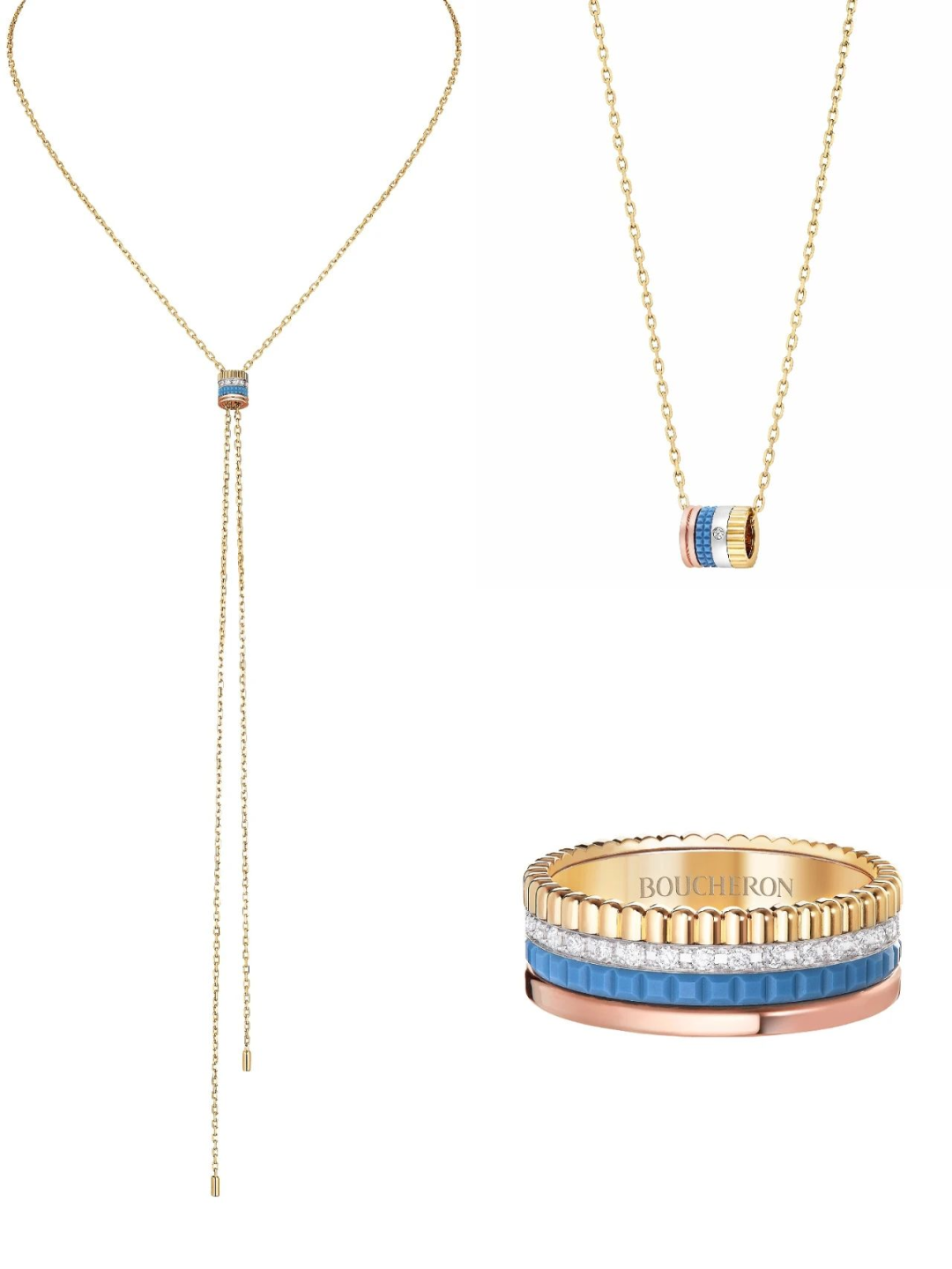 蓝色高精密陶瓷是耐磨的亚光质感,与黄金、玫瑰金、钻圈搭配在一起就显得很有格调。可调节长度的Tie项链是宝诗龙必入单品,身兼颈链、领带和锁骨链三职,轻松hold住一年四季所有的高光时刻。